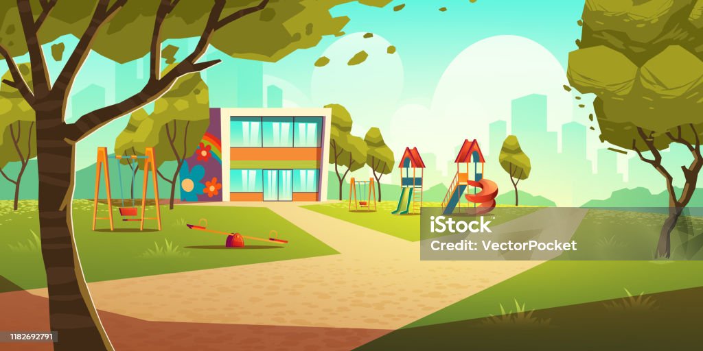 Kindergarten kids playground, empty area for children with nursery school colorful building, green grass, slides and swings for playing and recreation fun at summer time Cartoon vector illustration