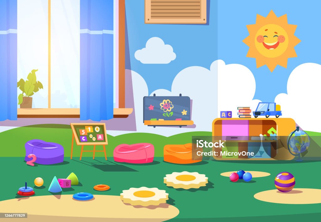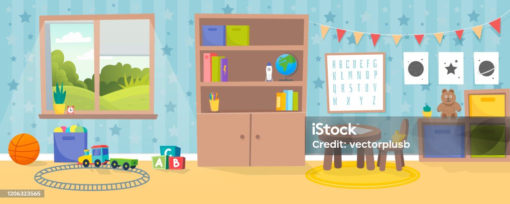 Kindergarten room. Empty playschool room with toys and furniture. Kids playroom cartoon vector interior. Playschool kindergarten, furniture indoor interior for play illustration